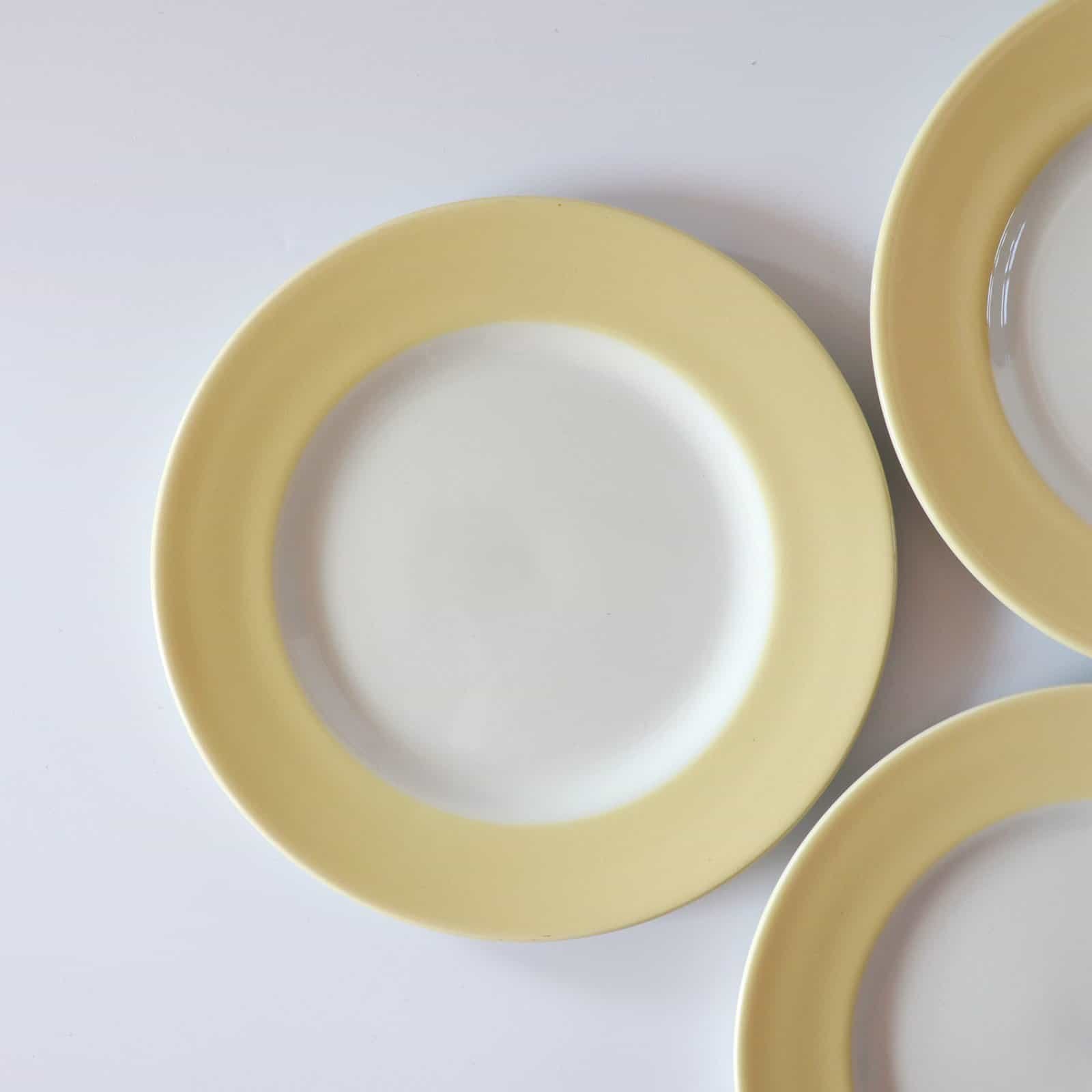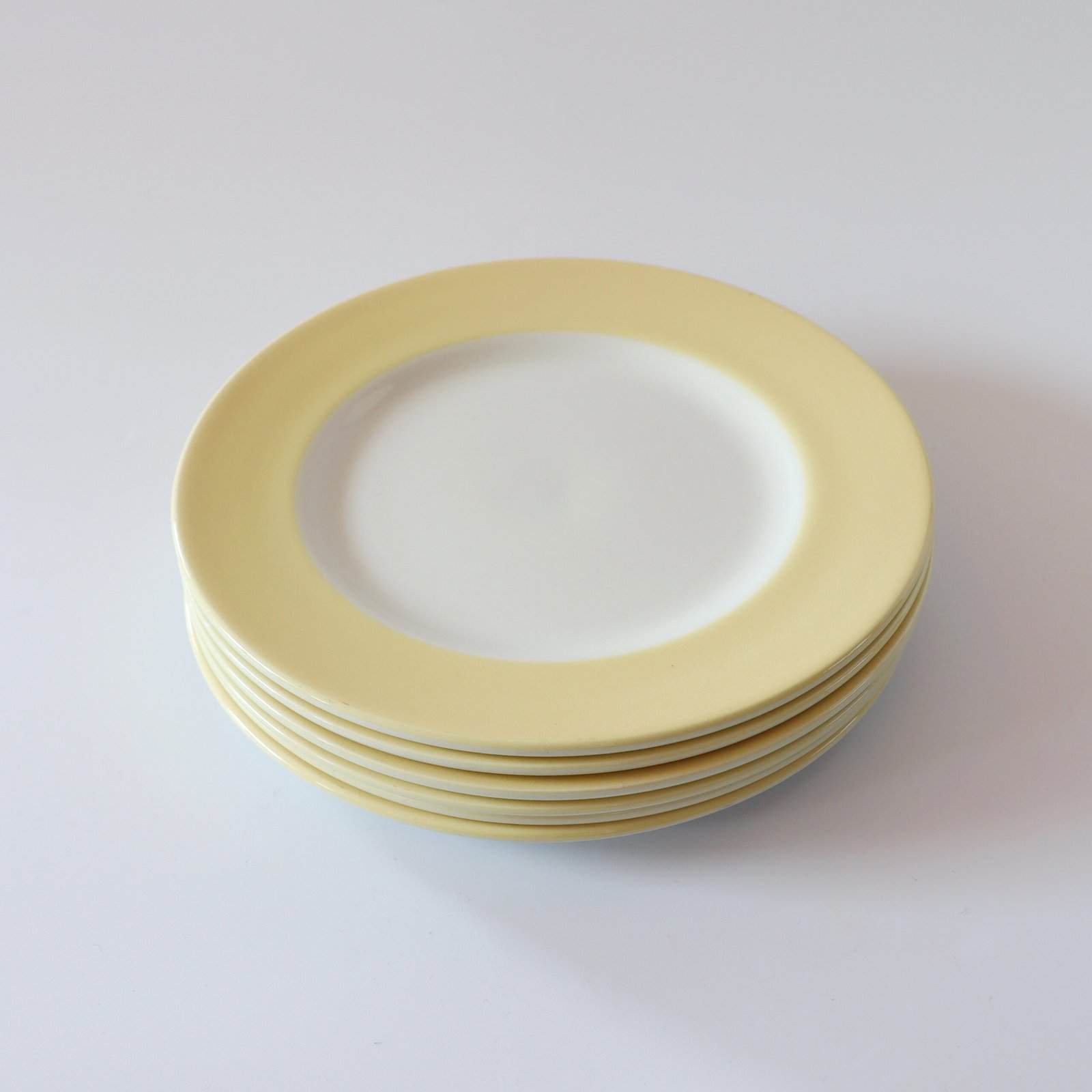 Set van 4 vintage Hema aardewerk borden met een lichtgele rand. Mooie kwaliteit aardewerk. Diameter: 22 cm.