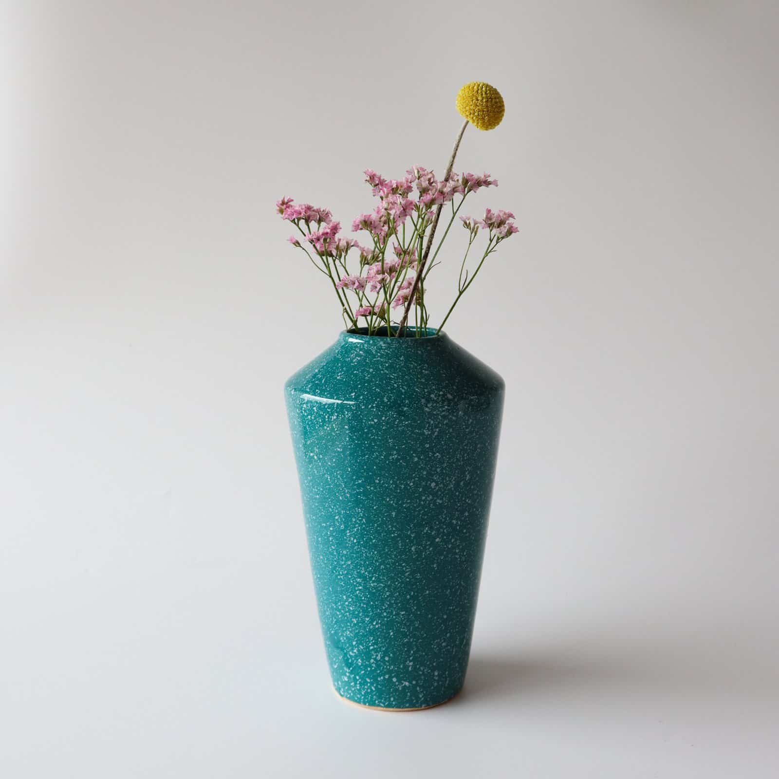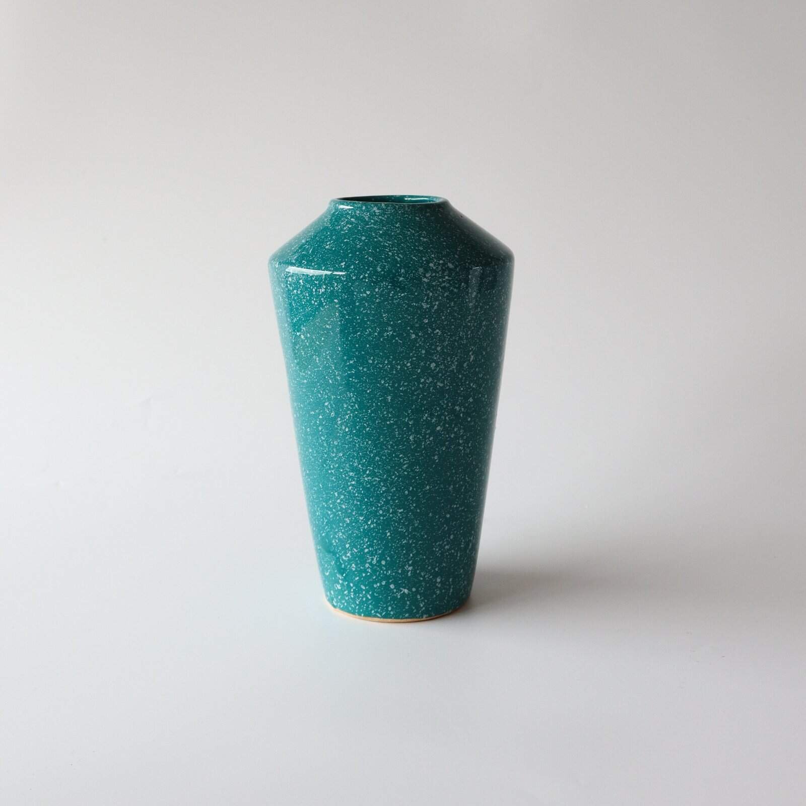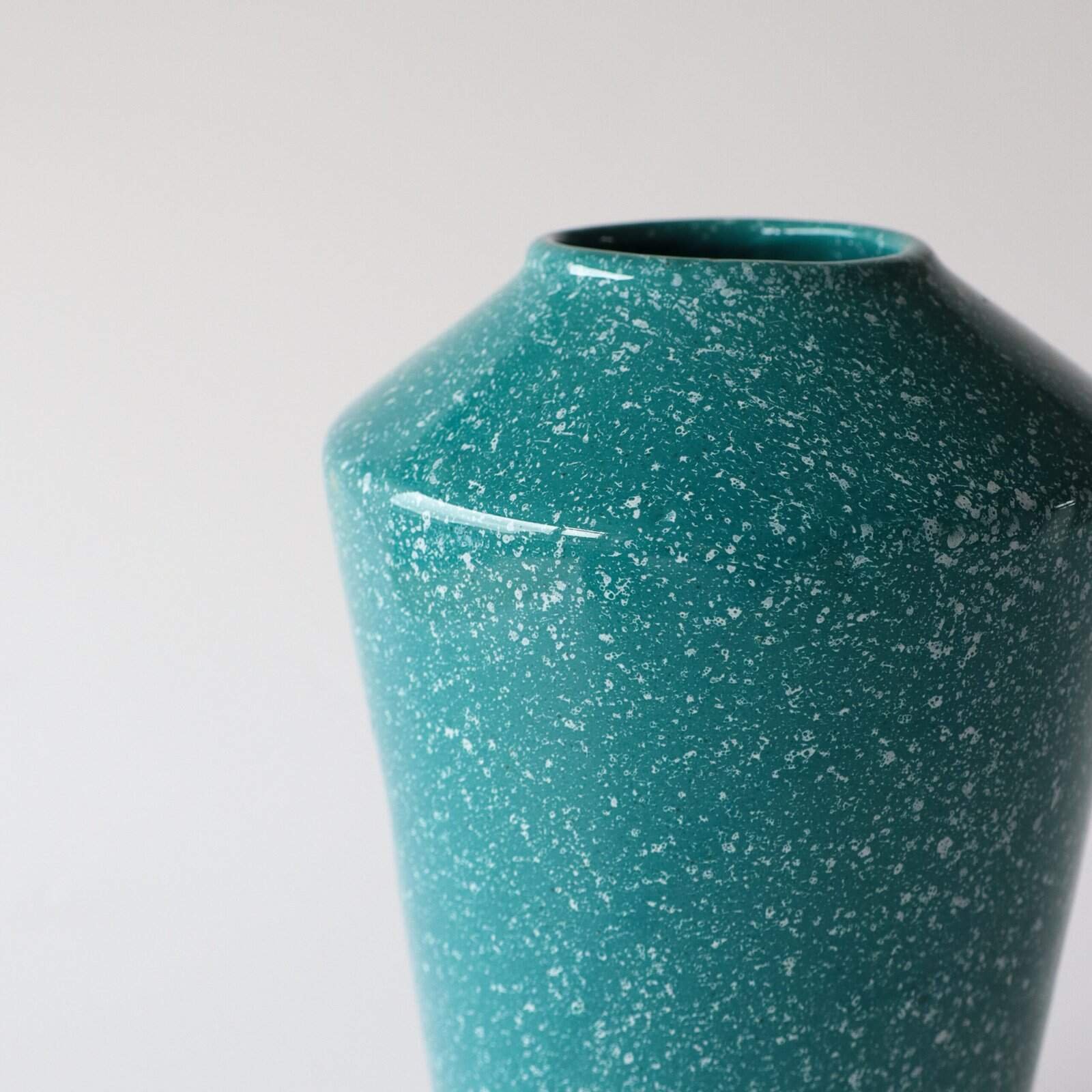 Turquoise aardewerk vaas met witte spikkeltjes. Heel tof design uit de jaren ’80. Hoogte: 20 cm.
