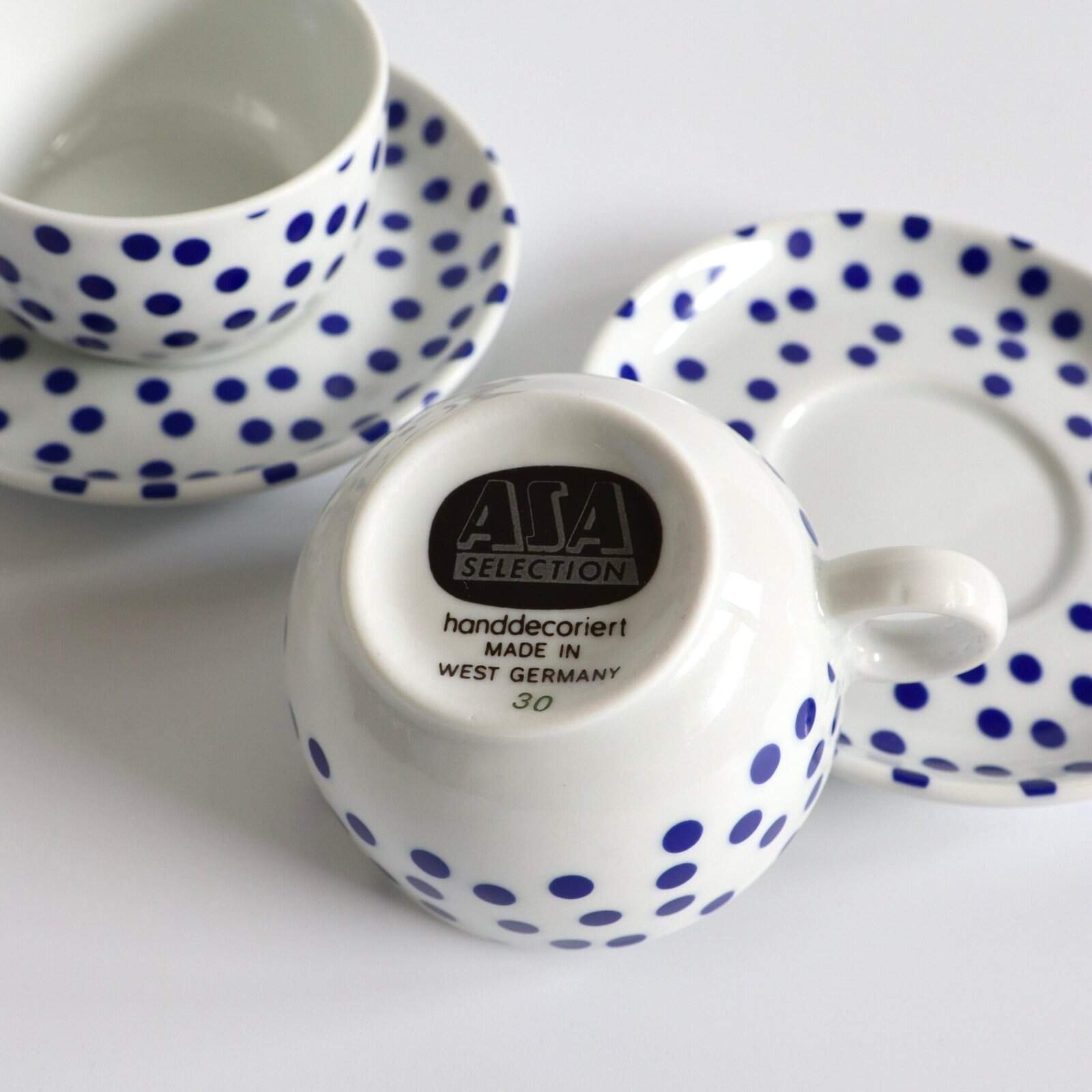 Set van 2 vintage kop- en schotels met blauwe polkadots van ASA Germany. Hebben een goed formaat voor espresso. Heel tof tijdloos design en mooie kwaliteit aardewerk.