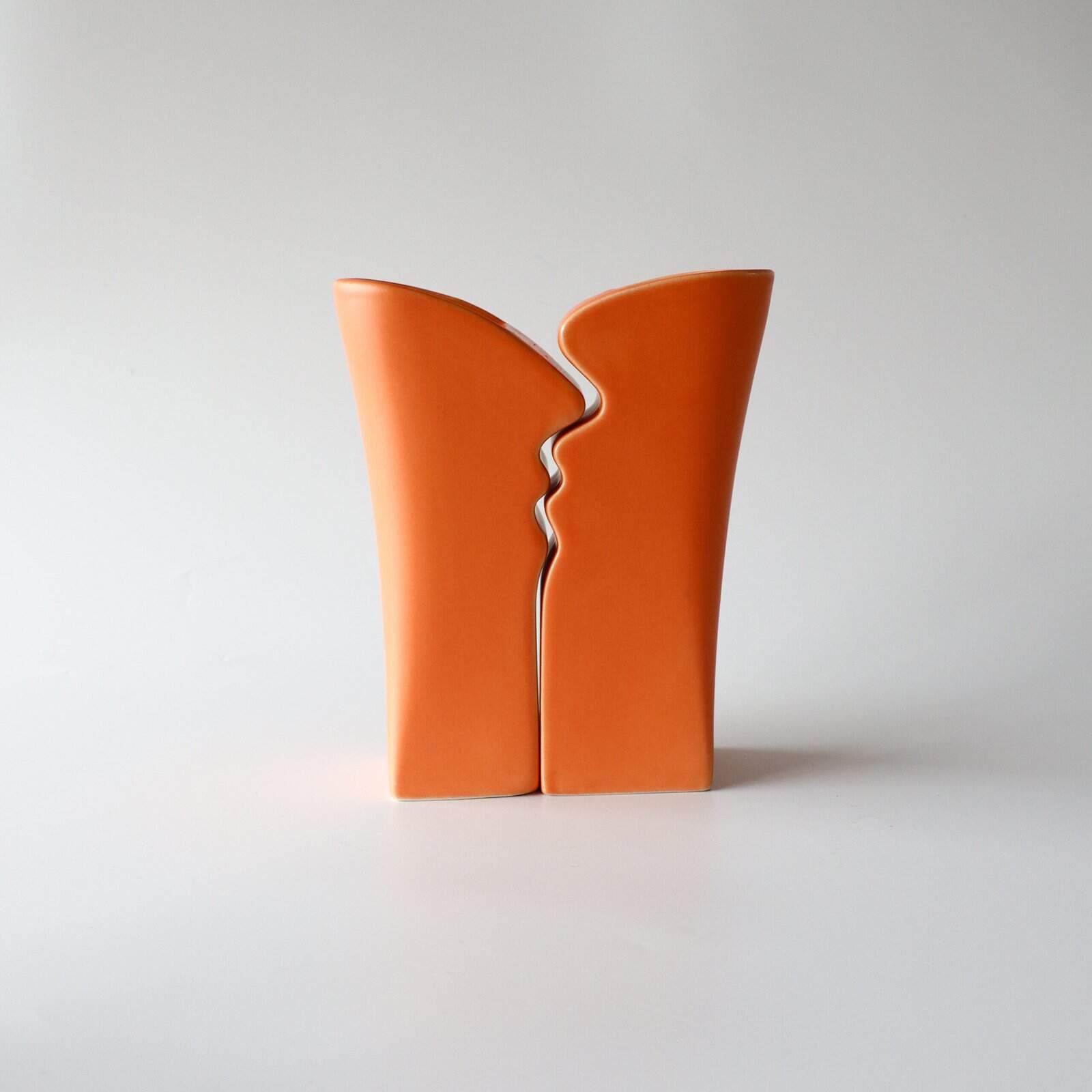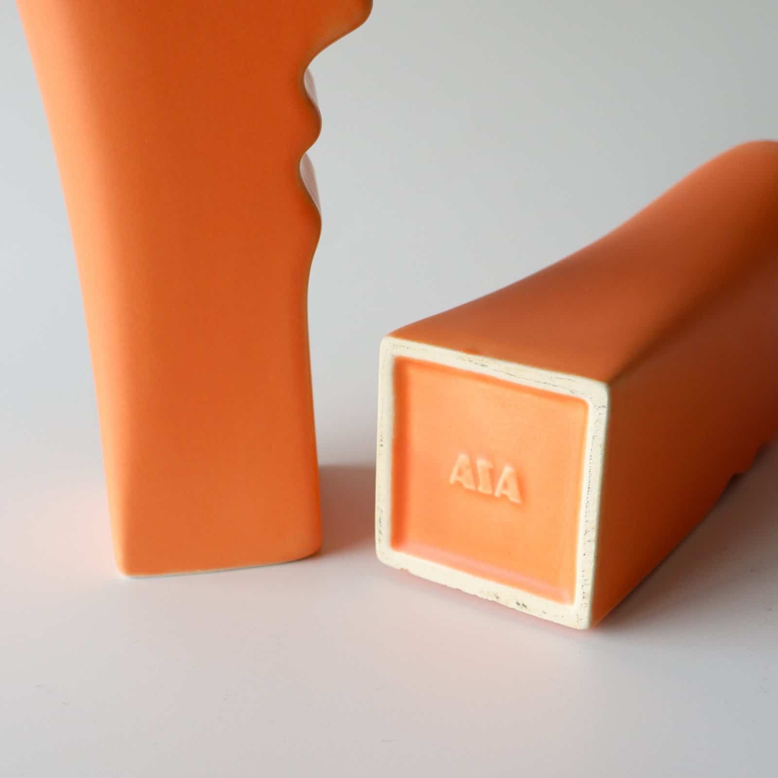 Vintage oranje aardewerk vaas van ASA Germany. Het zigzag design van de vaas is zo tof en bestaat dus uit twee stukken die perfect in elkaar passen. Echt een eye-catcher op een mooi dressoir bijvoorbeeld. Hoogte: 20 cm.