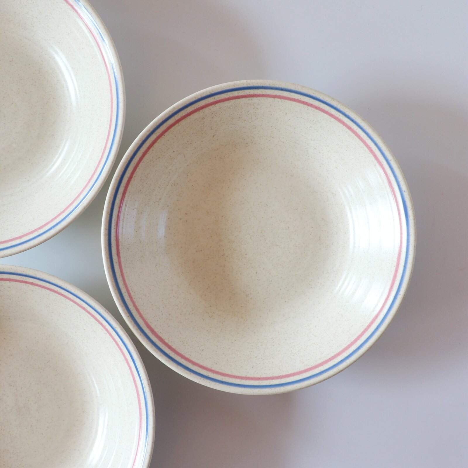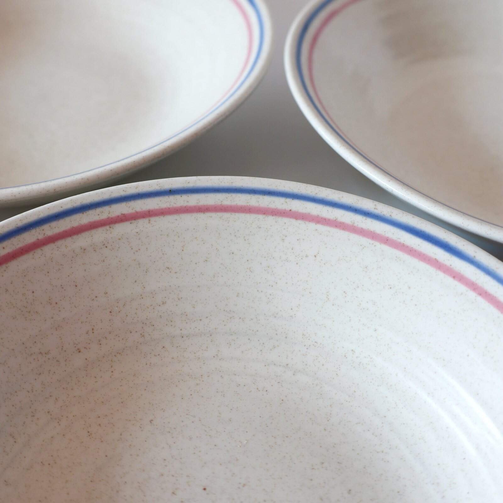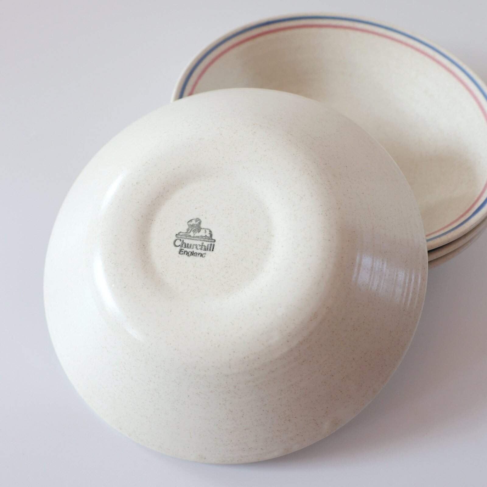 Set van 4 beige diepe borden van Churchill England. Ze hebben een matte finish en een heel leuk roze en lichtblauw randje. Gemaakt van hele mooie kwaliteit aardewerk. Diameter: 20 cm.