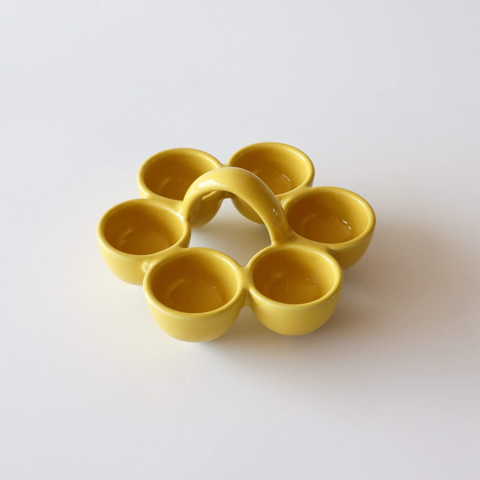 Deens rekje van keramiek voor 6 eieren in een heel lekker kleurtje geel. Perfect design en heel leuk voor een beetje kleur in je keuken. Gevonden in Denemarken. Diameter: 14 cm.