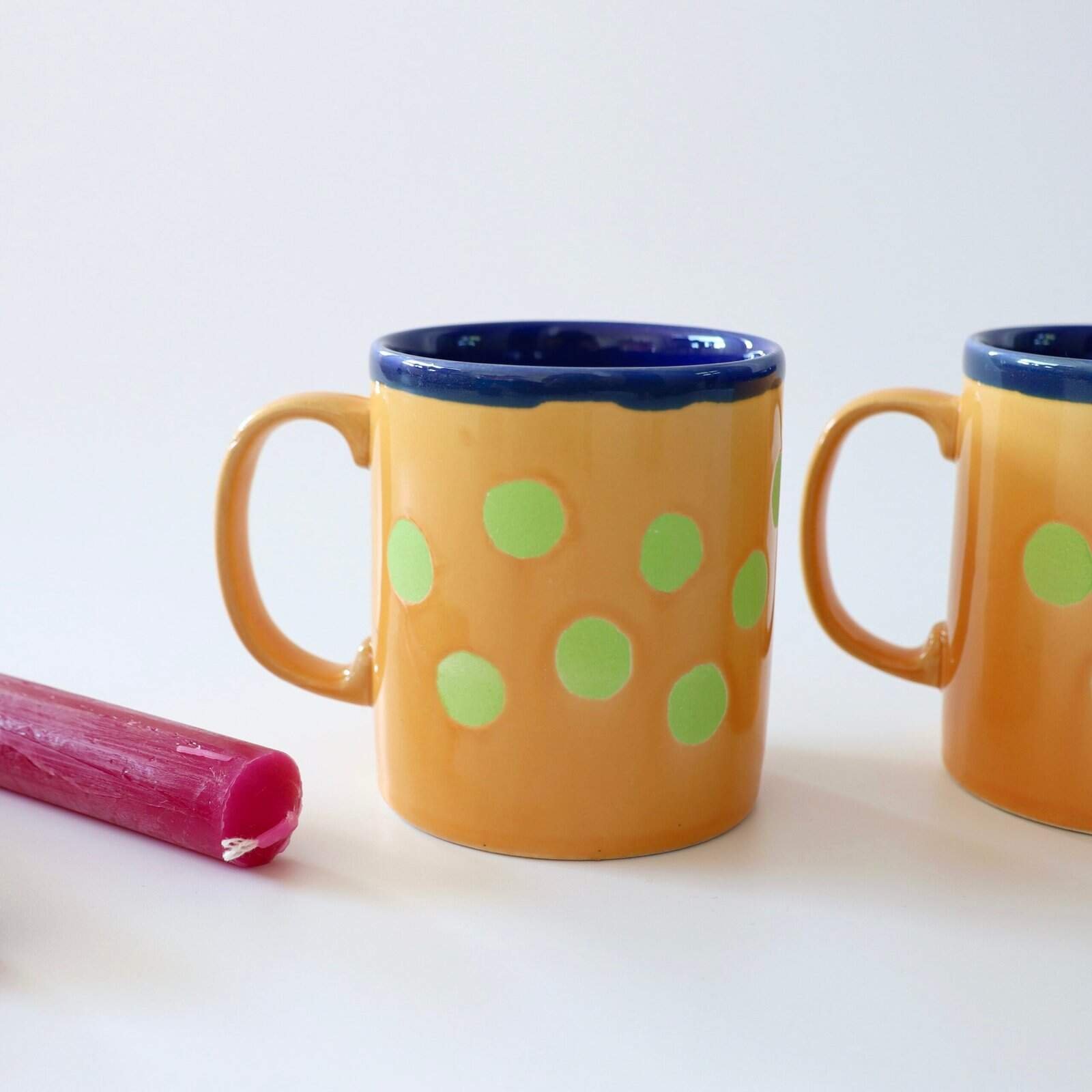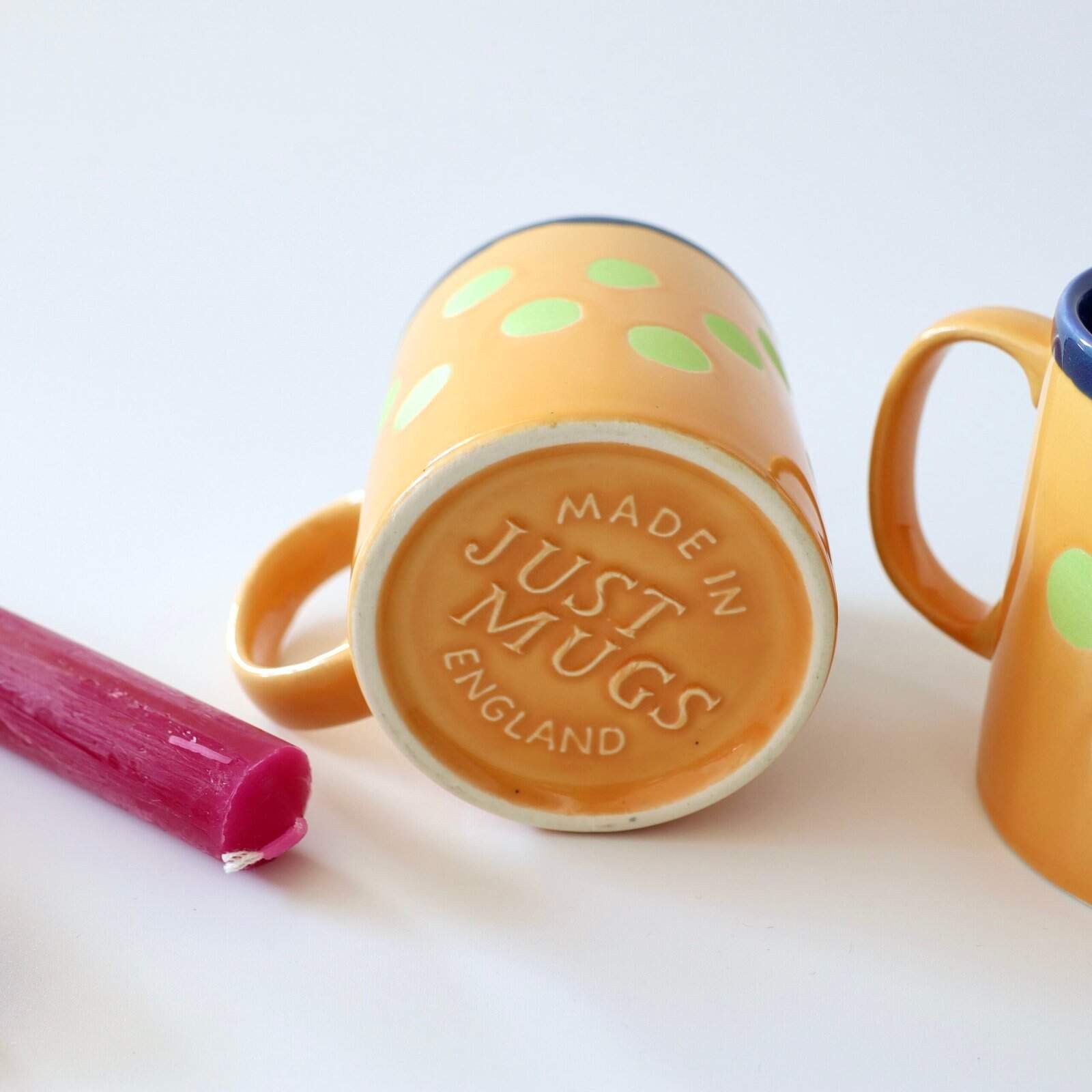 Set van 2 funky mokken van Just Mugs in een lekker kleurtje oranje met groene stippen.