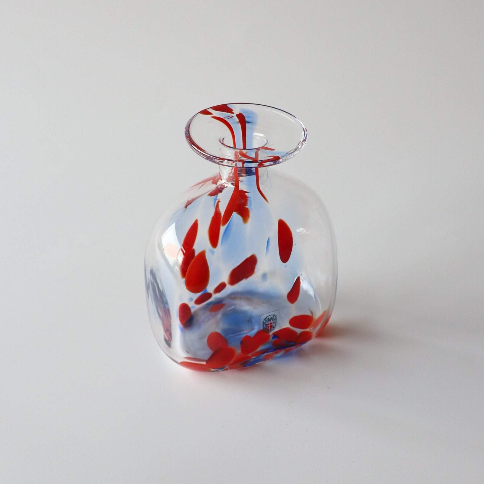 Decoratieve vaas van zwaar glas met een rood en blauw vlekjespatroon. Mondgeblazen vaas van Glashytten Nykøbing. Heel leuk als eye-catcher op een mooi dressoir bijvoorbeeld. Gevonden in Denemarken. Hoogte: 16 cm.