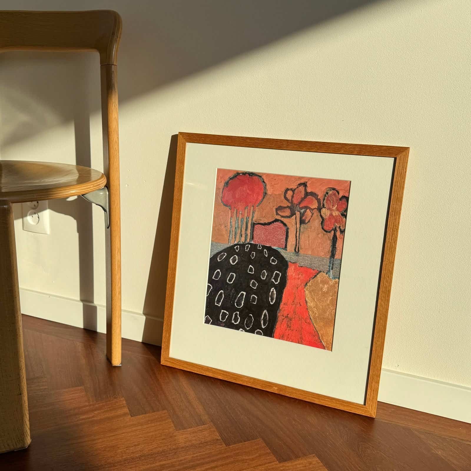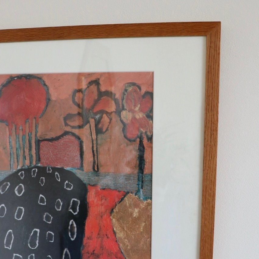 Geweldige artprint van Jeroen Krabbé met hele mooie peachy en terracotta kleuren. De print komt uit de jaren ’90 en is ingelijst door een lijstenmaker. De houten lijst en het passe-partout zijn van mooie kwaliteit. Afmeting: 48 x 54 cm.