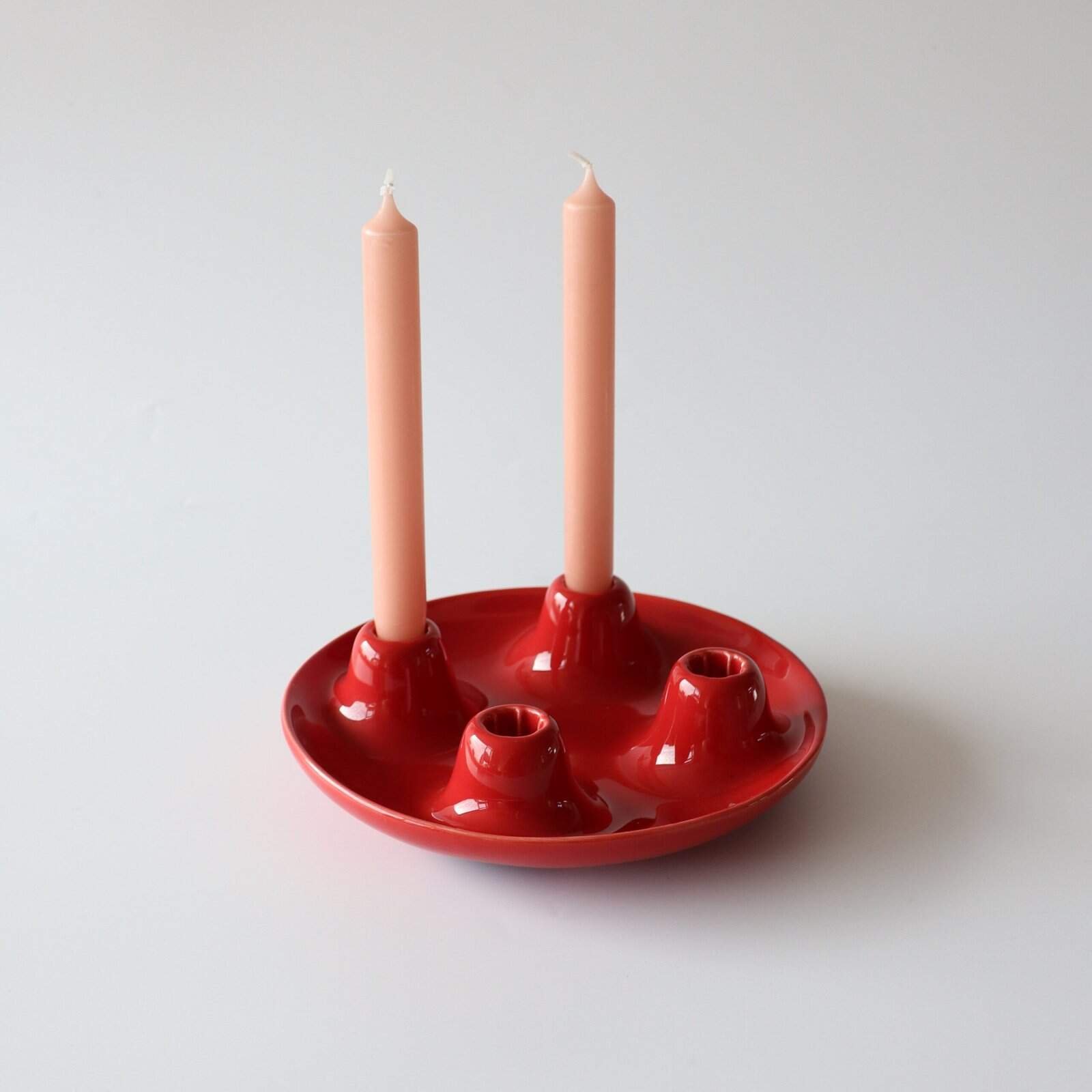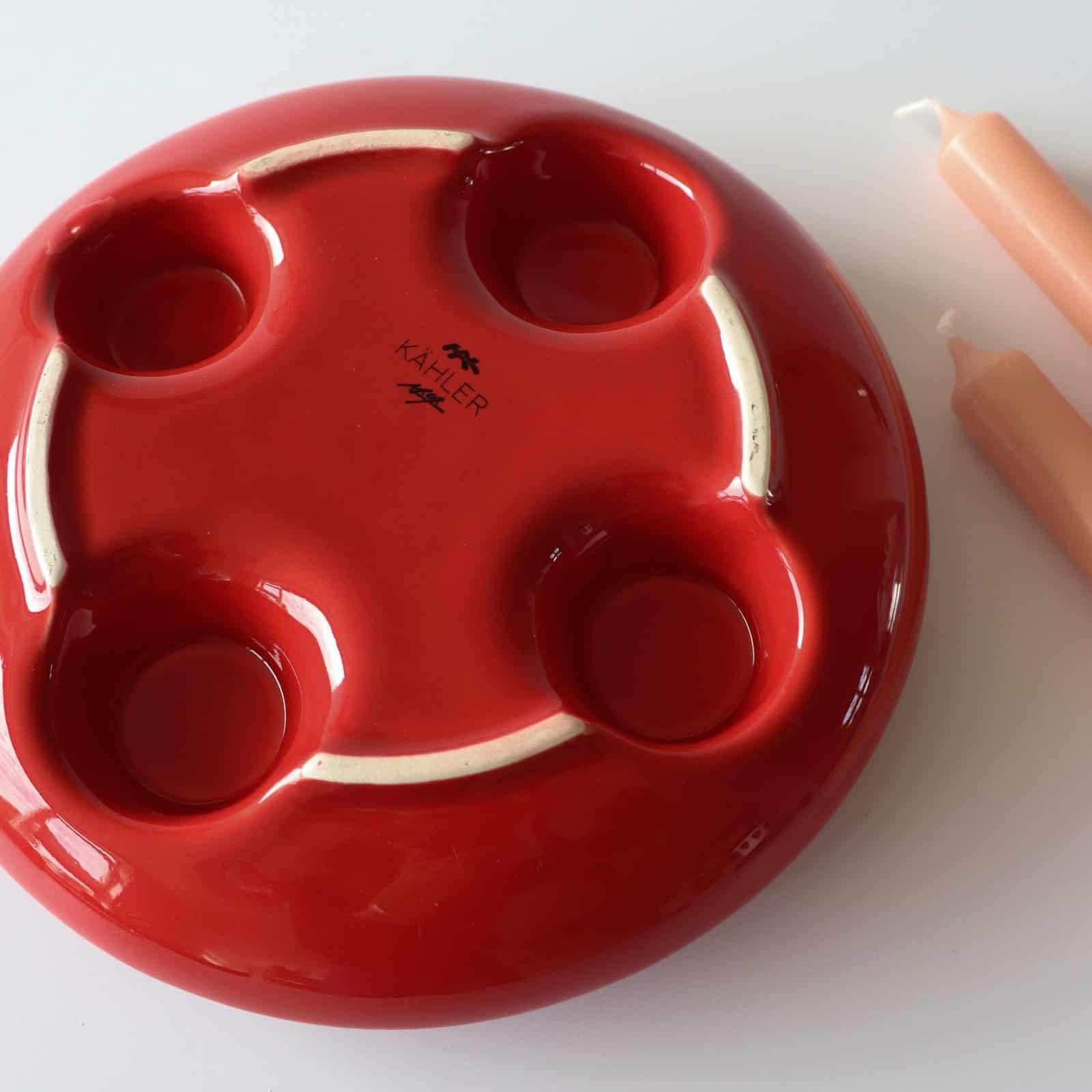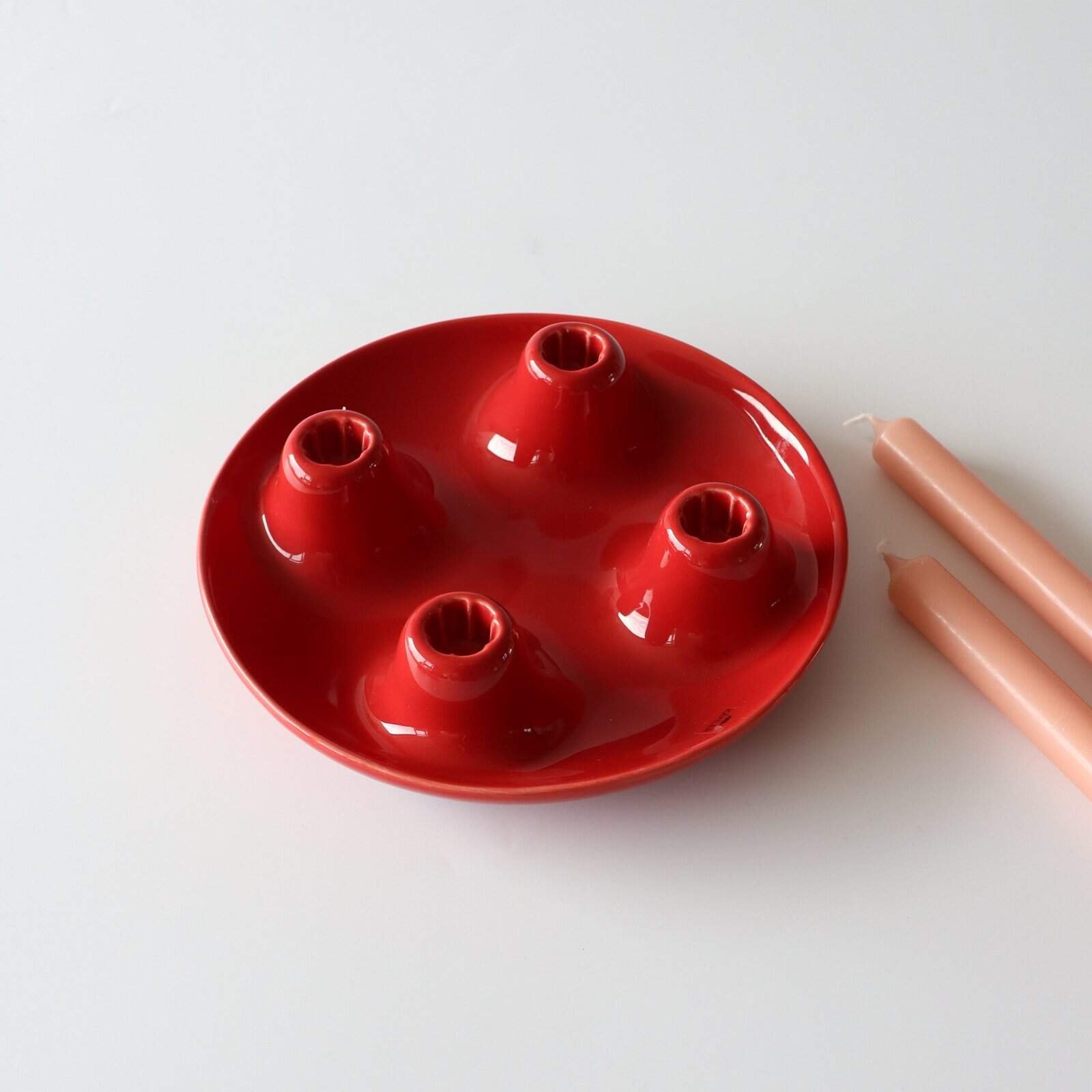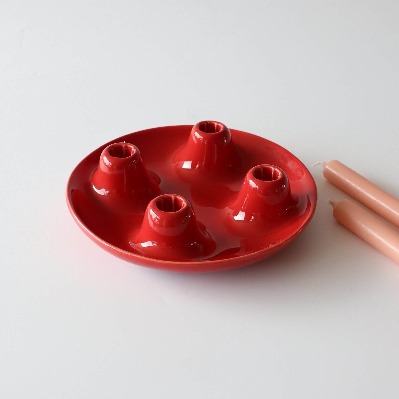 Kähler Illumina rode aardewerk kandelaar voor vier dinerkaarsen. Heel tof op een dressoir of eettafel. Deens design. Diameter: 20 cm.