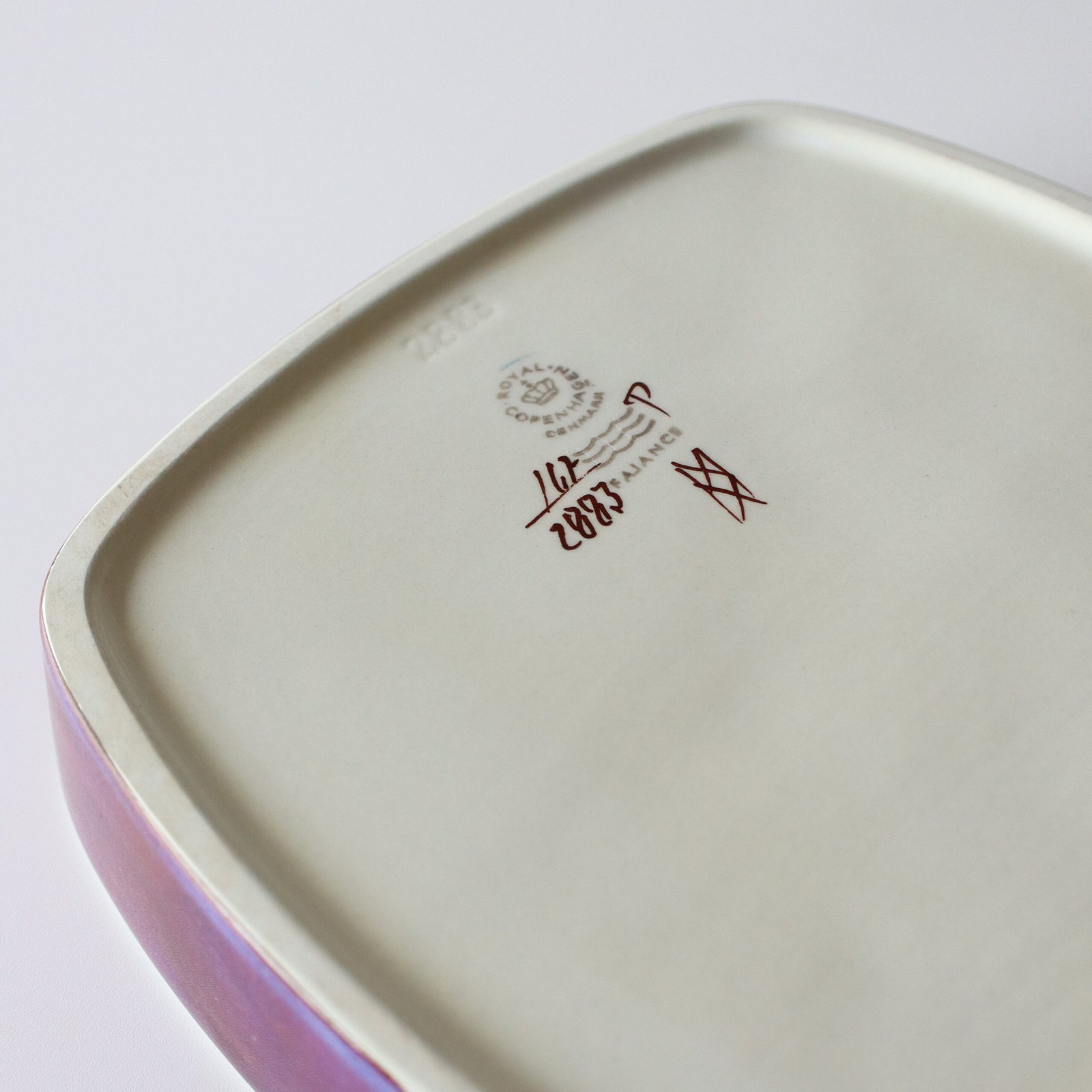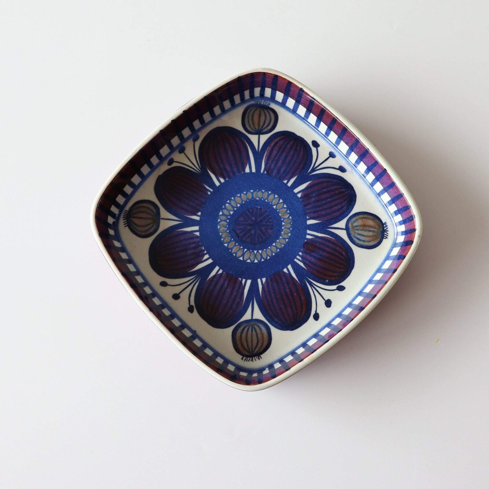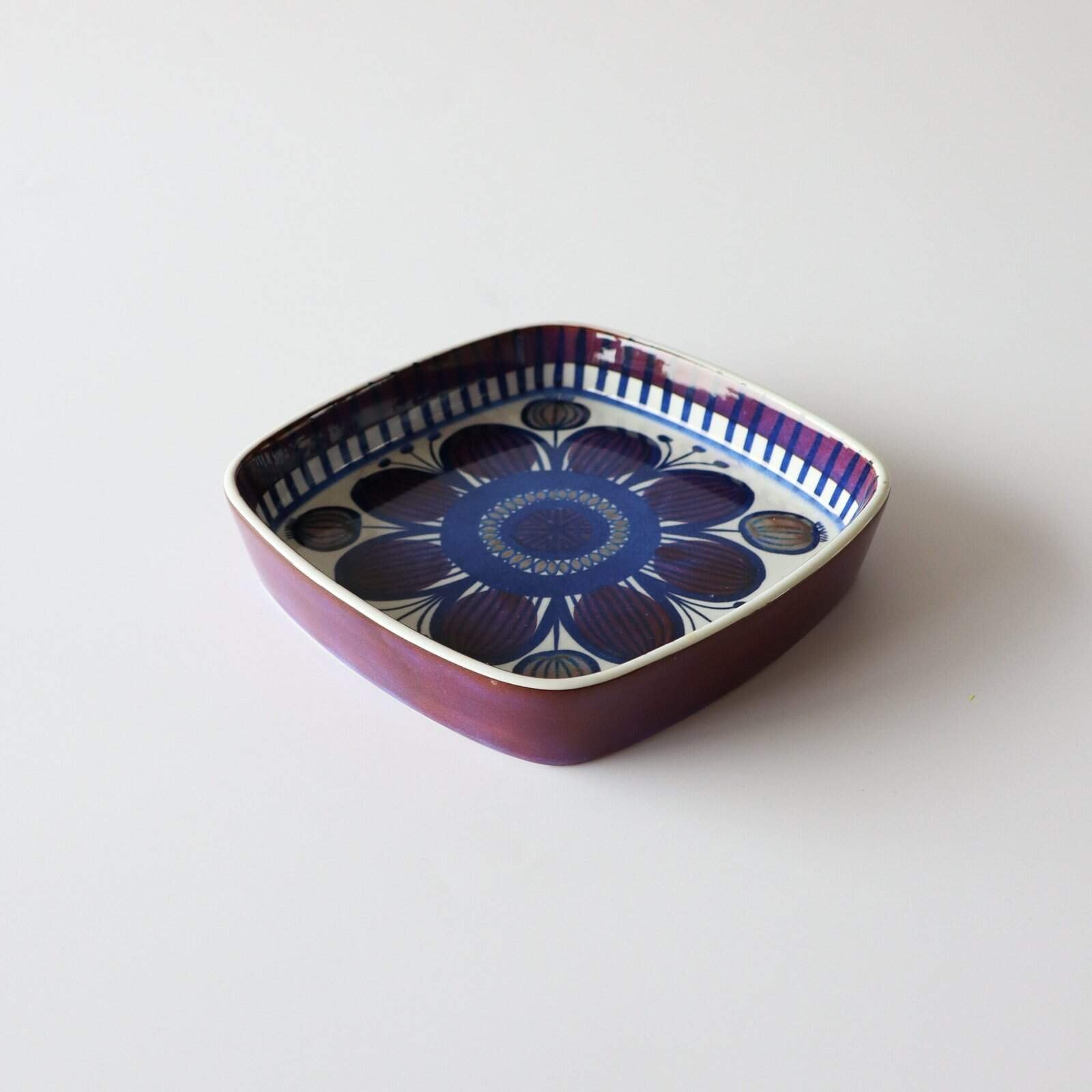 Vintage Fajance schaal van Royal Copenhagen. Geweldig design door Beth Breyen met verschillende tinten paars en blauw. Gemaakt van keramiek en gesigneerd 167 2883. Functioneel te gebruiken, maar ook tof als decoratie op een dressoir of tafel. Afmeting: 16 x 16 cm.