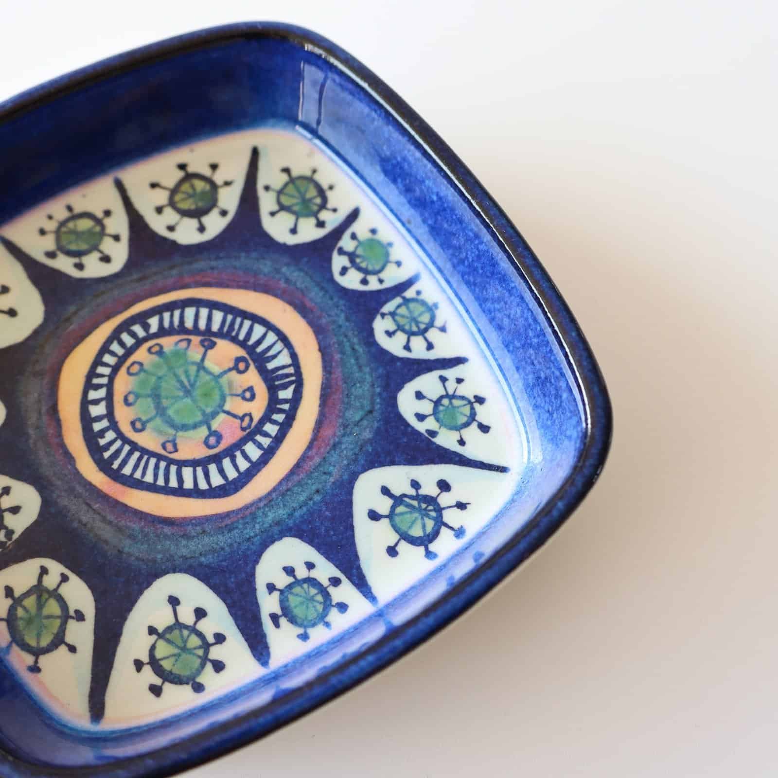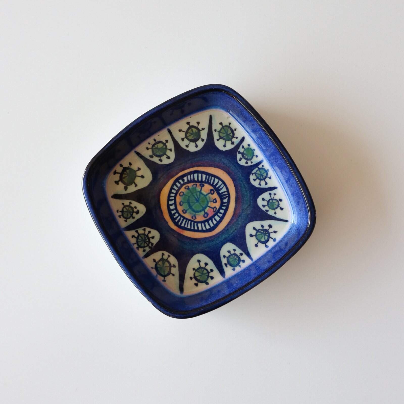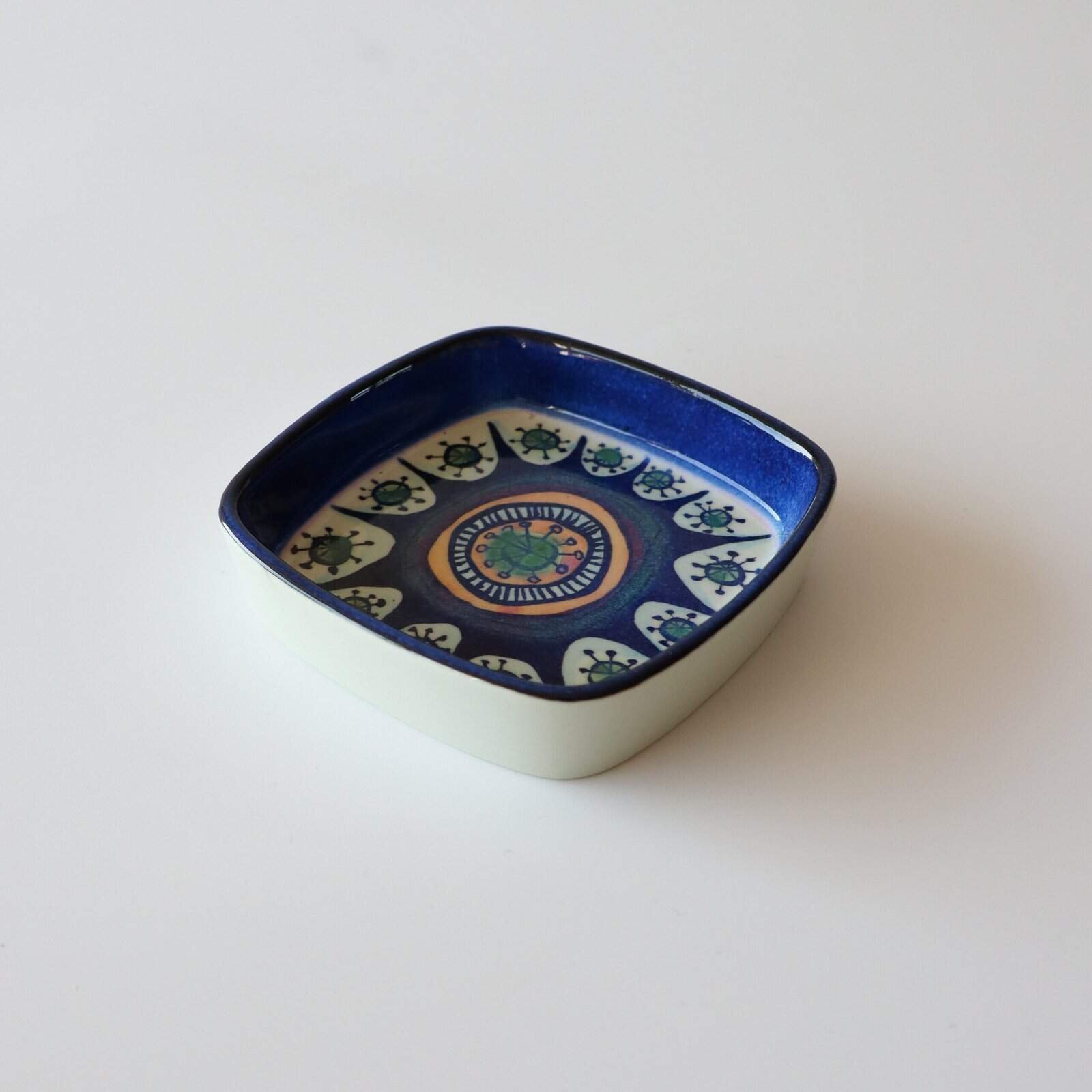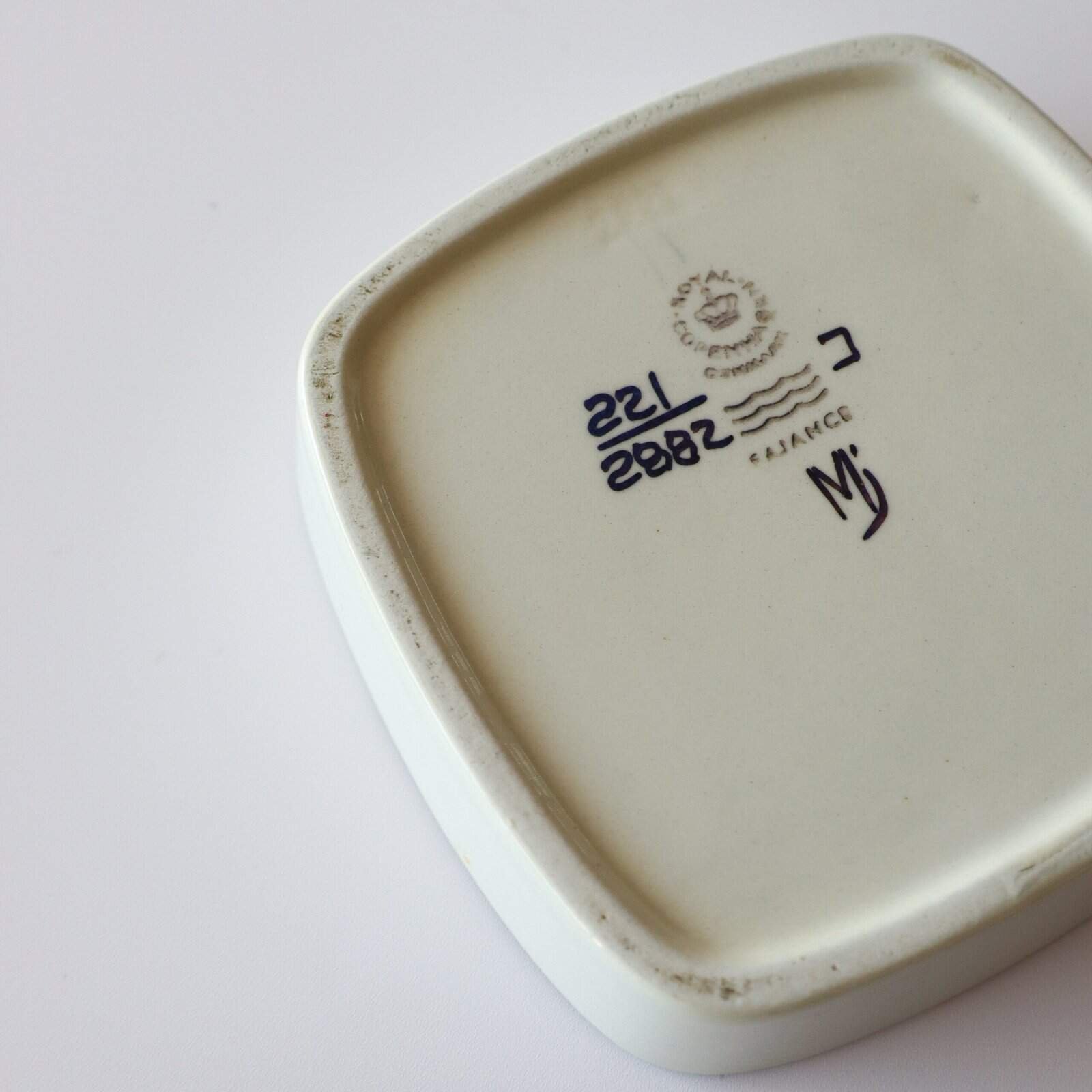 Vintage Fajance schaal van Royal Copenhagen. Geweldig design door Marianne Johnson met verschillende tinten blauw, paars en oranje. Gemaakt van keramiek en gesigneerd 221 2882. Functioneel te gebruiken, maar ook tof als decoratie op een dressoir of tafel. Afmeting: 11 x 11 cm.