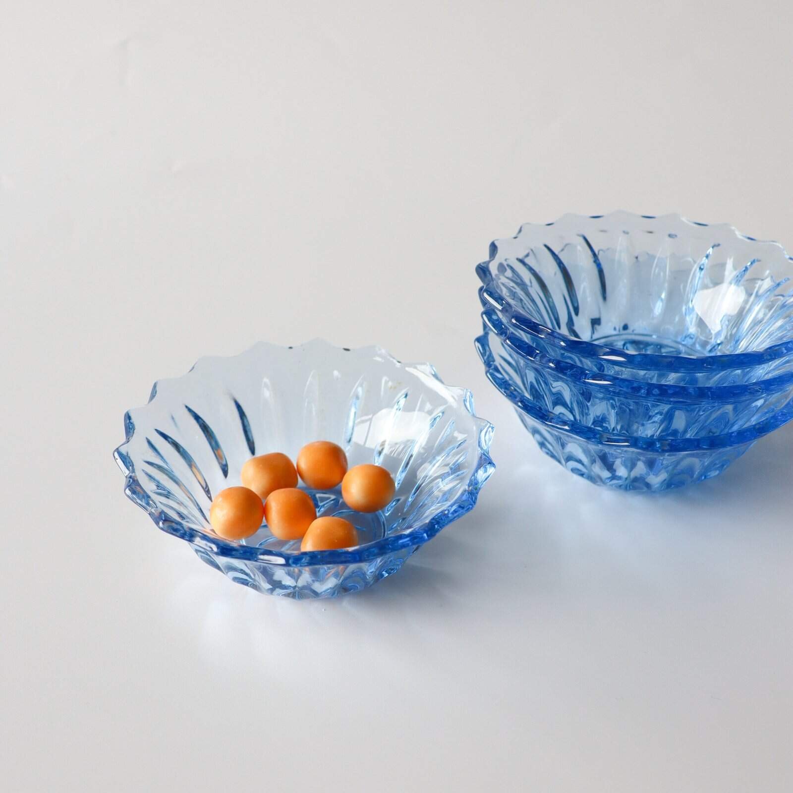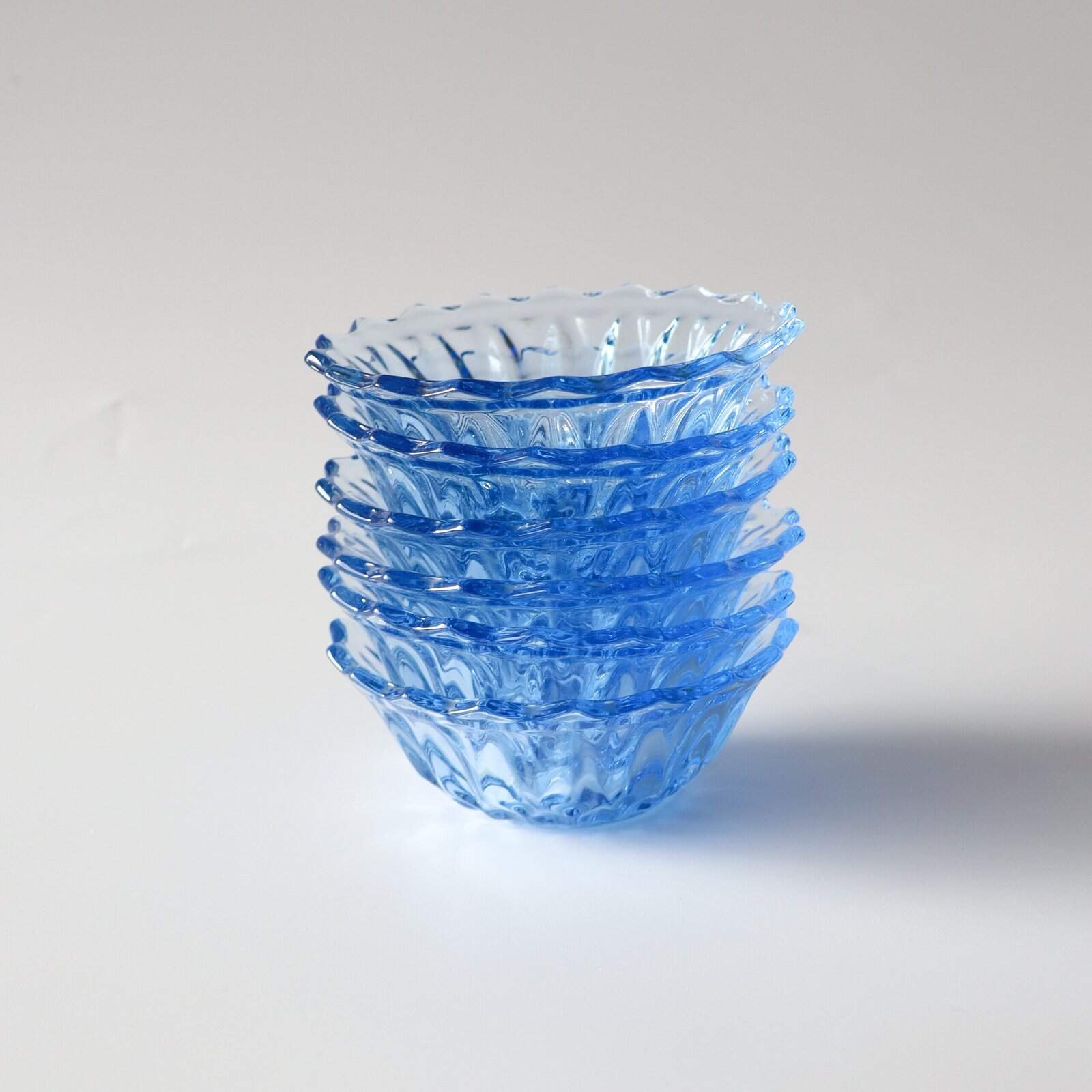 Set van 6 vintage kommetjes van lichtblauw persglas. Zware kwaliteit glas met mooie decoratie. Leuk voor desserts of snacks. Diameter: 12 cm.