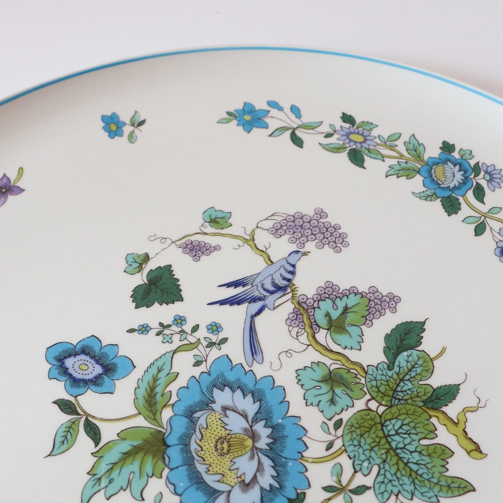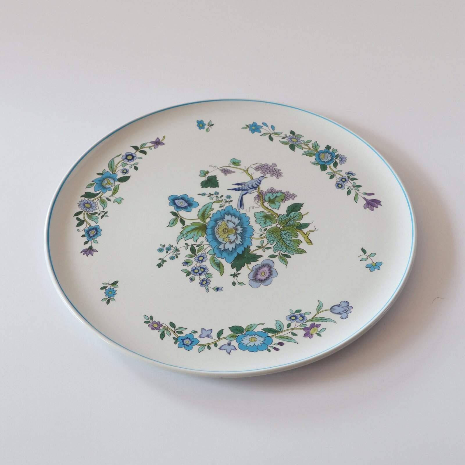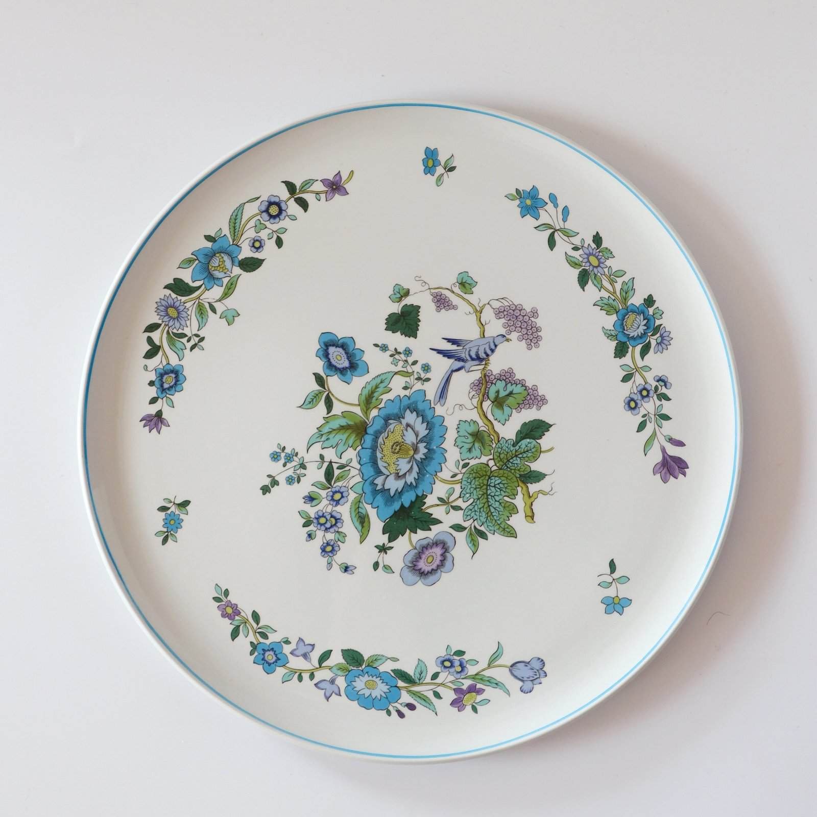 Spode England Mulberry XL aardewerk bord. Heeft een heel mooi blauw lila design met bloemen en vogels. Heel leuk voor taart of als serveerschaal. Diameter: 31 cm.