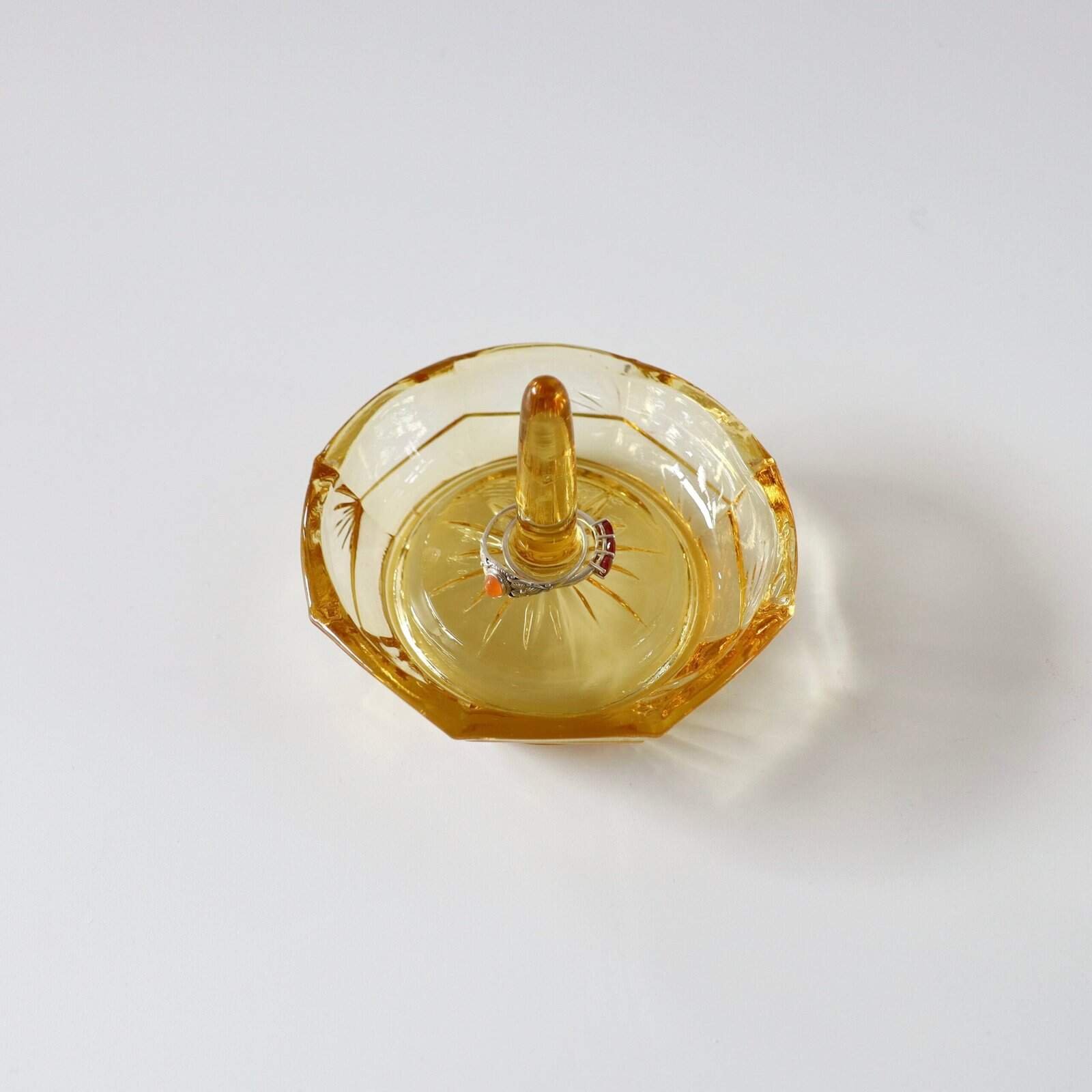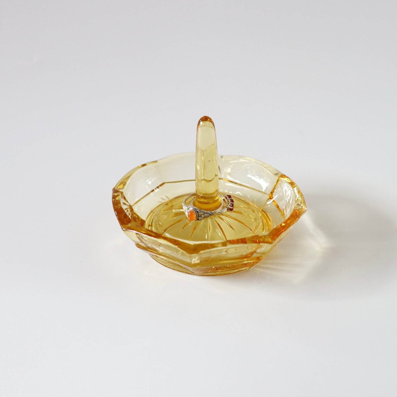 Vintage ringhouder uit de 70’s van geel persglas met mooie details. Diameter: 10 cm.