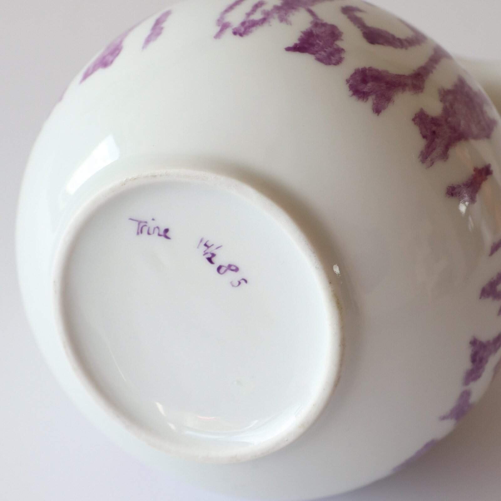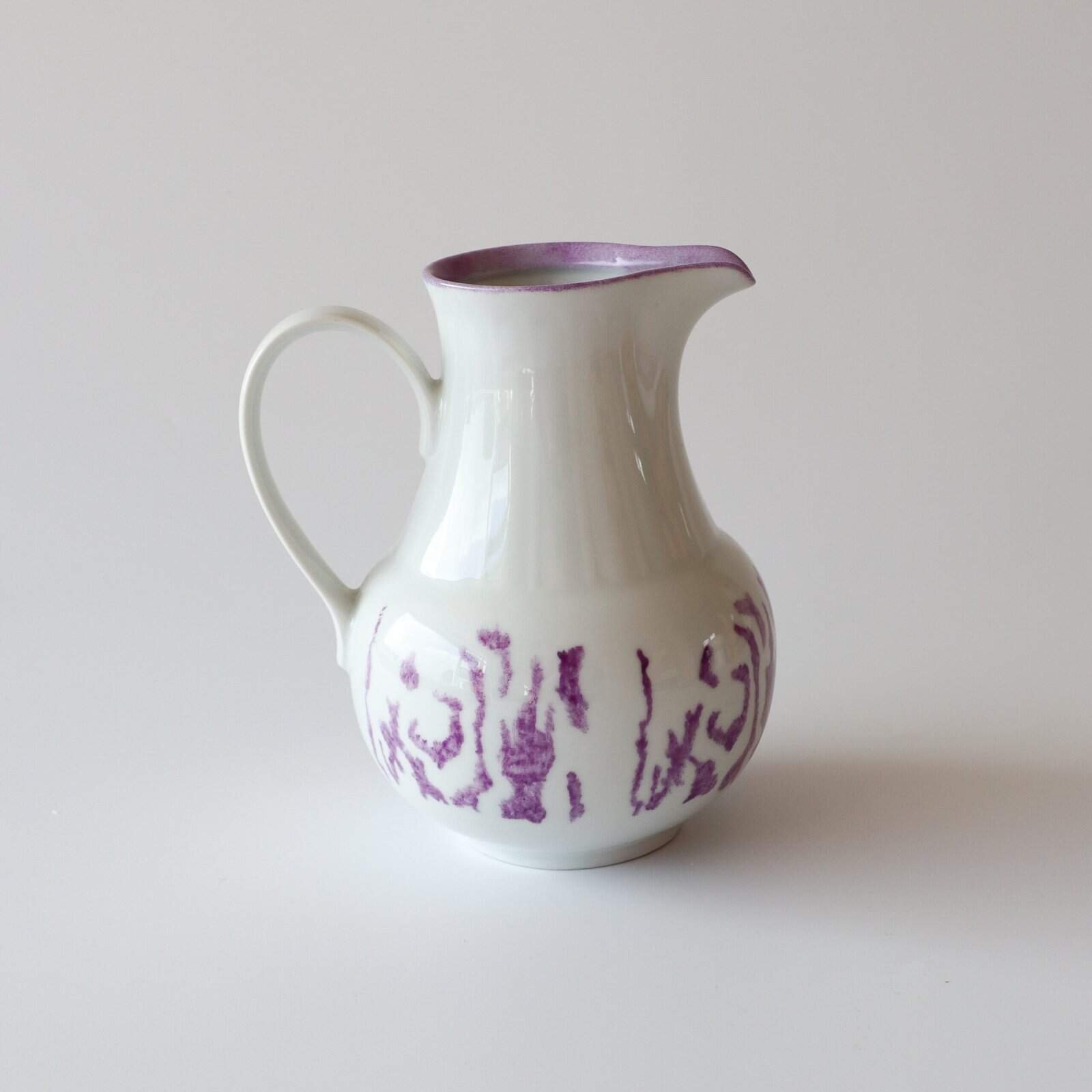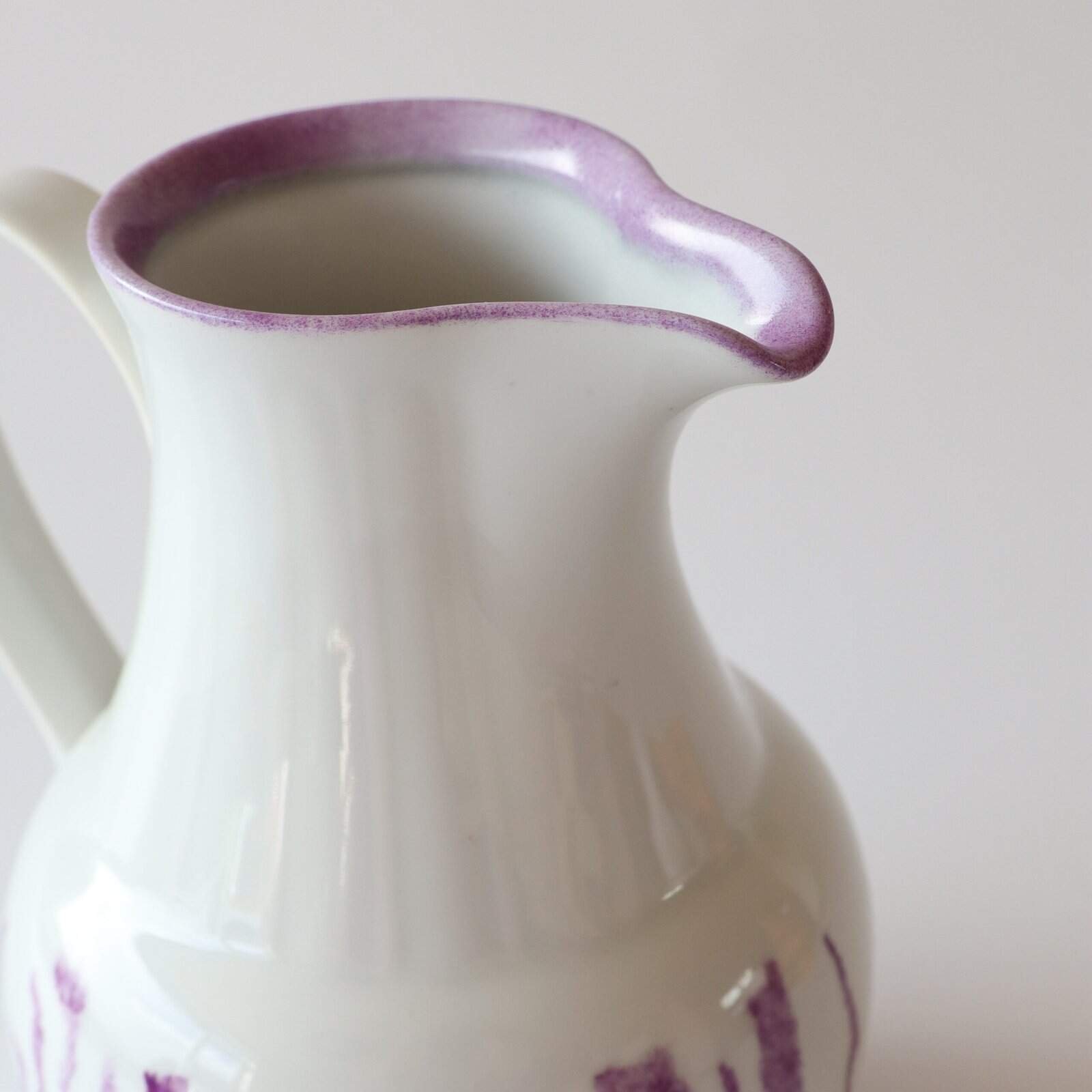 Vintage aardewerk kan met een lila design. Heel leuk voor in je keuken of als waterkan op tafel. Gevonden in Denemarken. Hoogte: 18 cm.