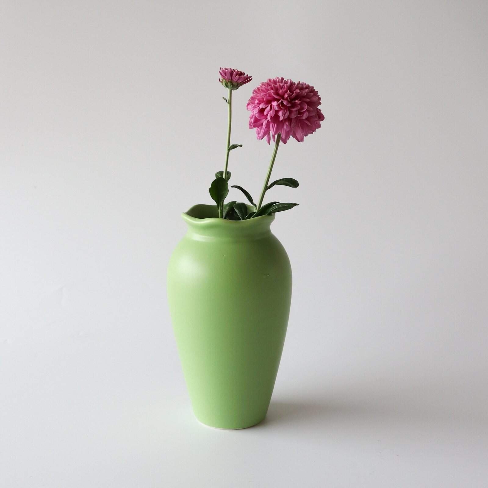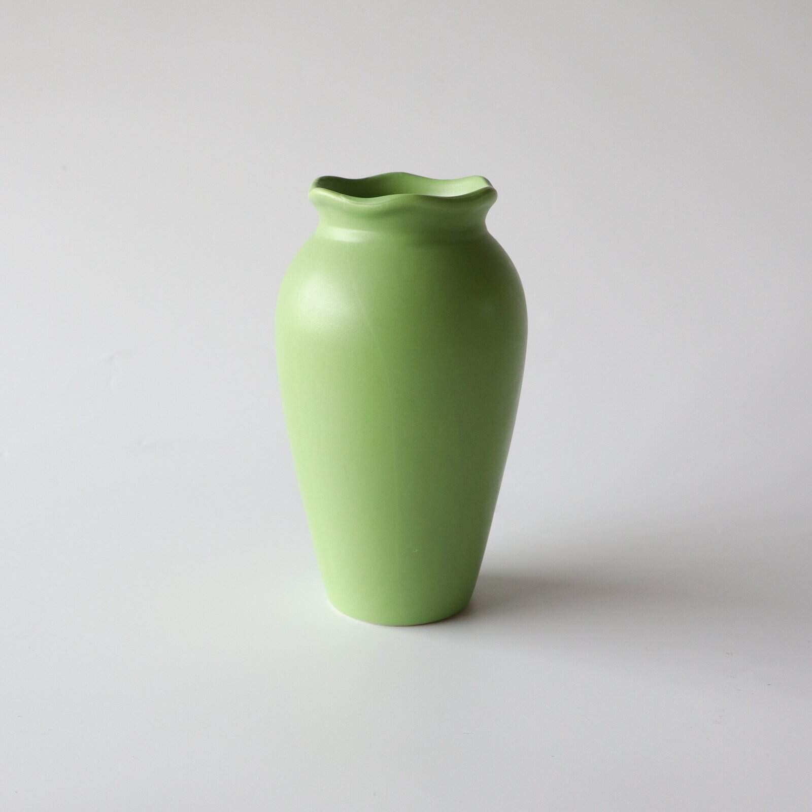 Vintage aardewerk groene vaas met een wavy randje. Mooie kwaliteit aardewerk en glazuur. Gevonden in Denemarken. Hoogte: x cm.