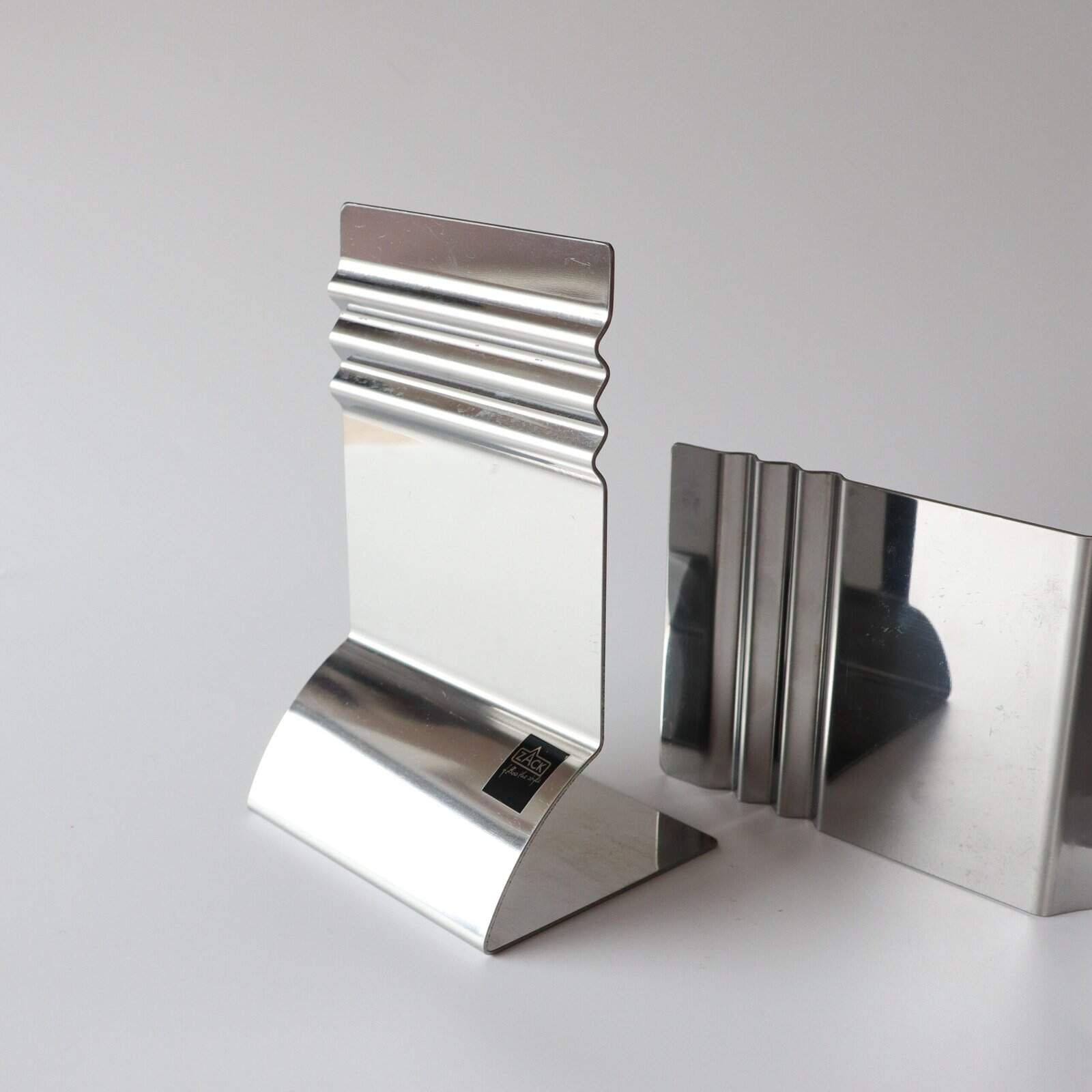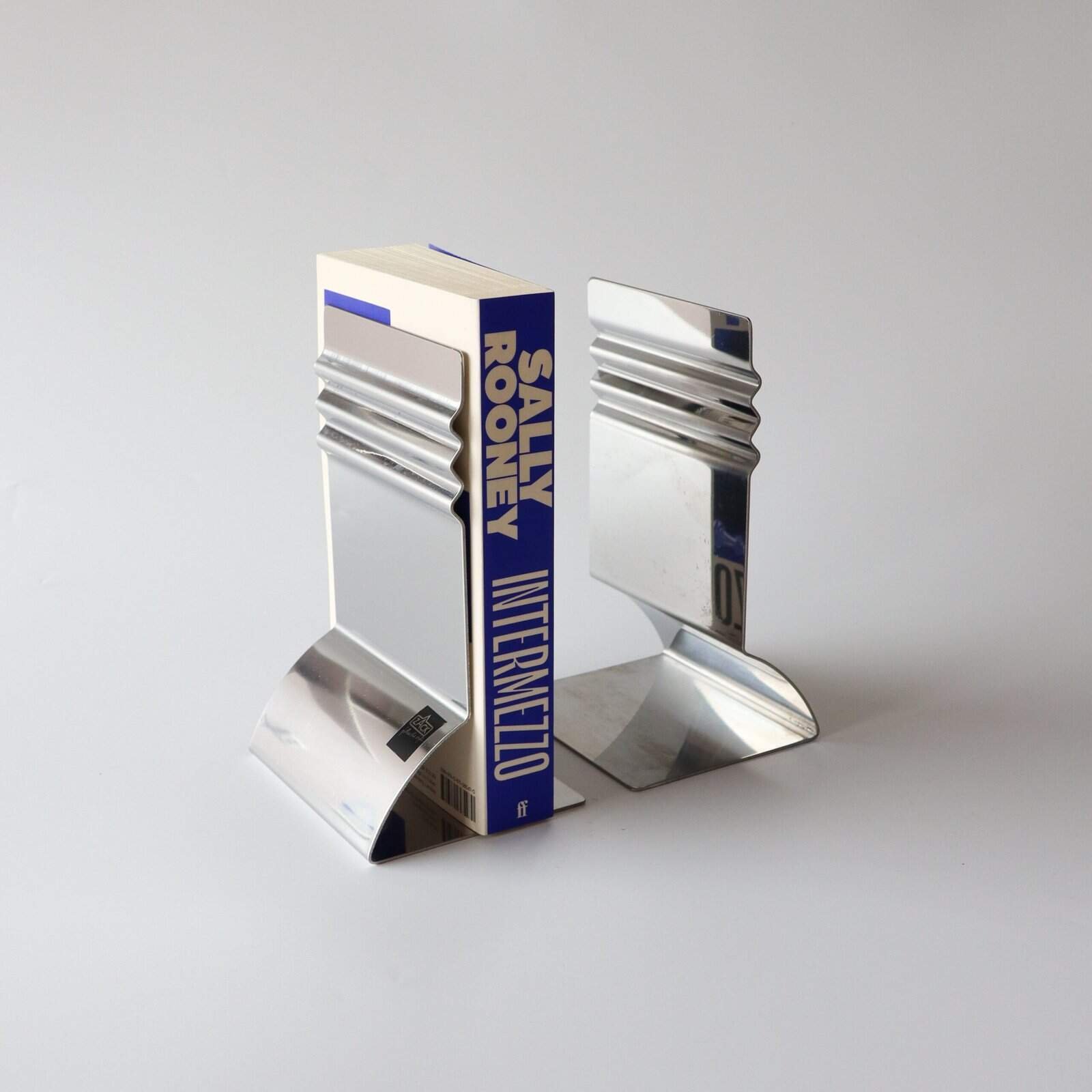Rvs boekensteunen van Zack design uit de 90’s. Heel tof minimalistisch design met een zigzag detail. Glimmen nog mooi. Hoogte: 19 cm.